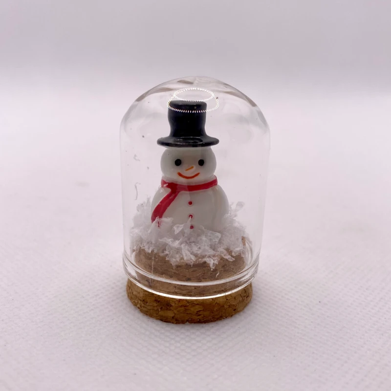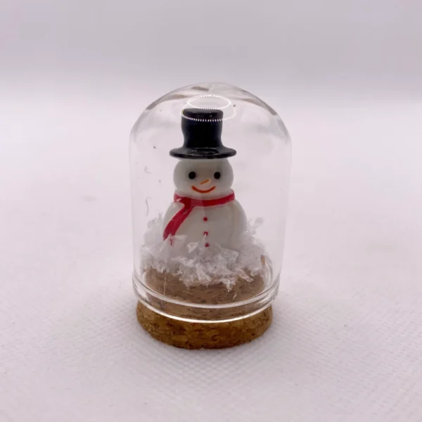 A happy snowman sitting in his bed of snow in this tiny handcrafted dome. Each one unique.