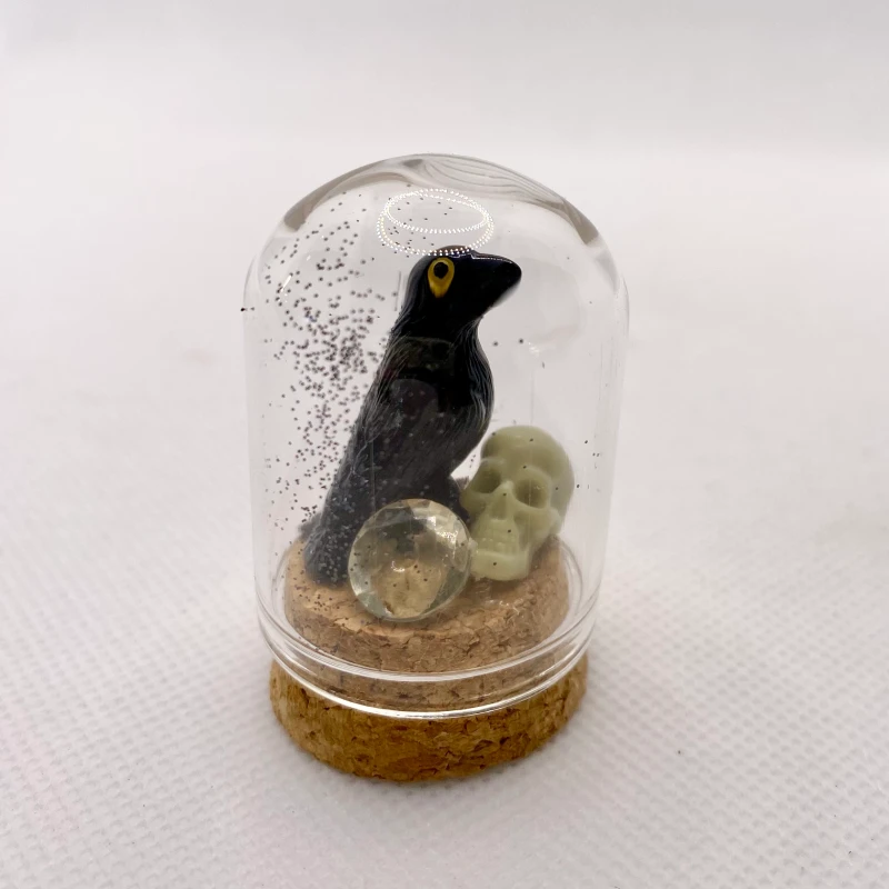 Teeny black crow with skull and crystal, dancing in galactic glitter. Hanging out together in this tiny handcrafted dome. Each one unique.
